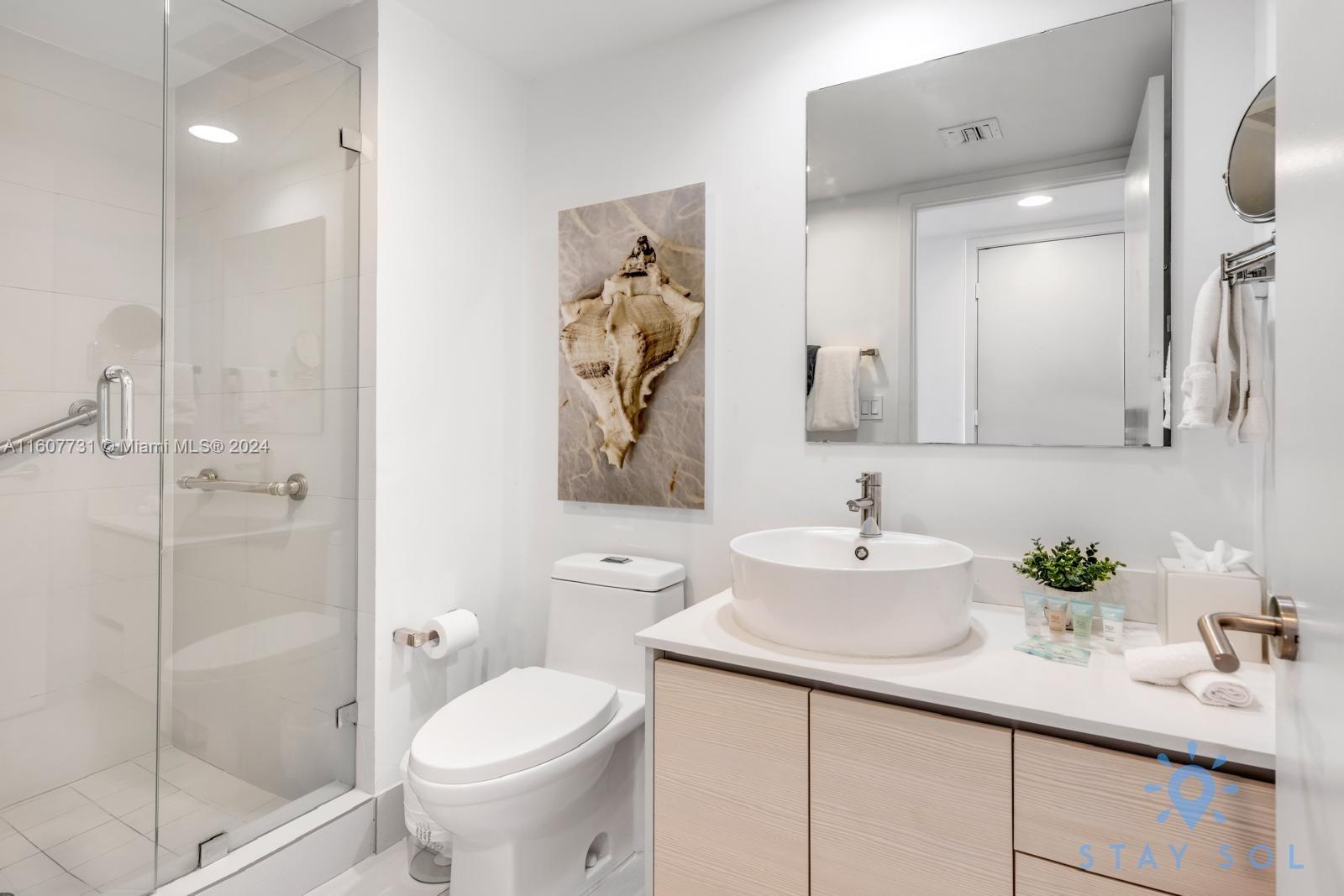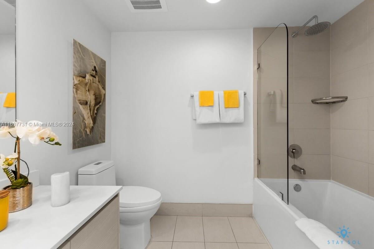 This condo includes two spacious bedrooms, each designed to serve as a peaceful sanctuary. The primary suite features a walk-in closet and en-suite bathroom, complete with a tub and shower combination. Each bathroom boasts elegant finishes, including marble tiling and premium fixtures, delivering a spa-like experience.