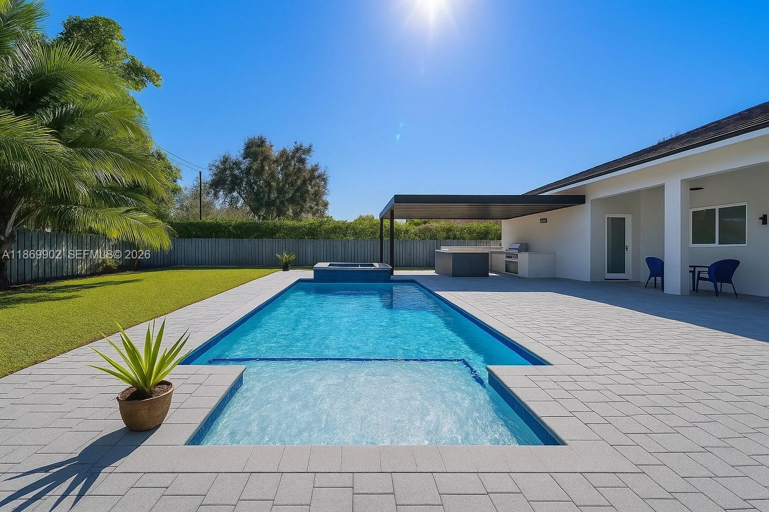 MOTIVATED SELLER!!! Come see the best priced newer construction home built by a contractor. This beautiful 4,500+ SQFT, 4-BD, 5-BA home sits on a sizable 18k+ SF lot. The residence showcases beautiful curb appeal on quiet block. Walk into 13 foot ceilings with custom oversize 8 ft doors. An eat-in kitchen offering marble & granite countertops, stainless-steel appliances, built-in island/table doubles as seating, & walk-in pantry for extra storage. The open layout seamlessly connects the kitchen, & family rooms with sliding doors to the patio, merging indoor and outdoor entertainment areas. Enjoy your backyard all year round, covered patio, & plenty of room to entertain guests. Additional features include an irrigation with well water, Generator, impact, 2-car garage, pre-wired for security cameras & surround sound.
