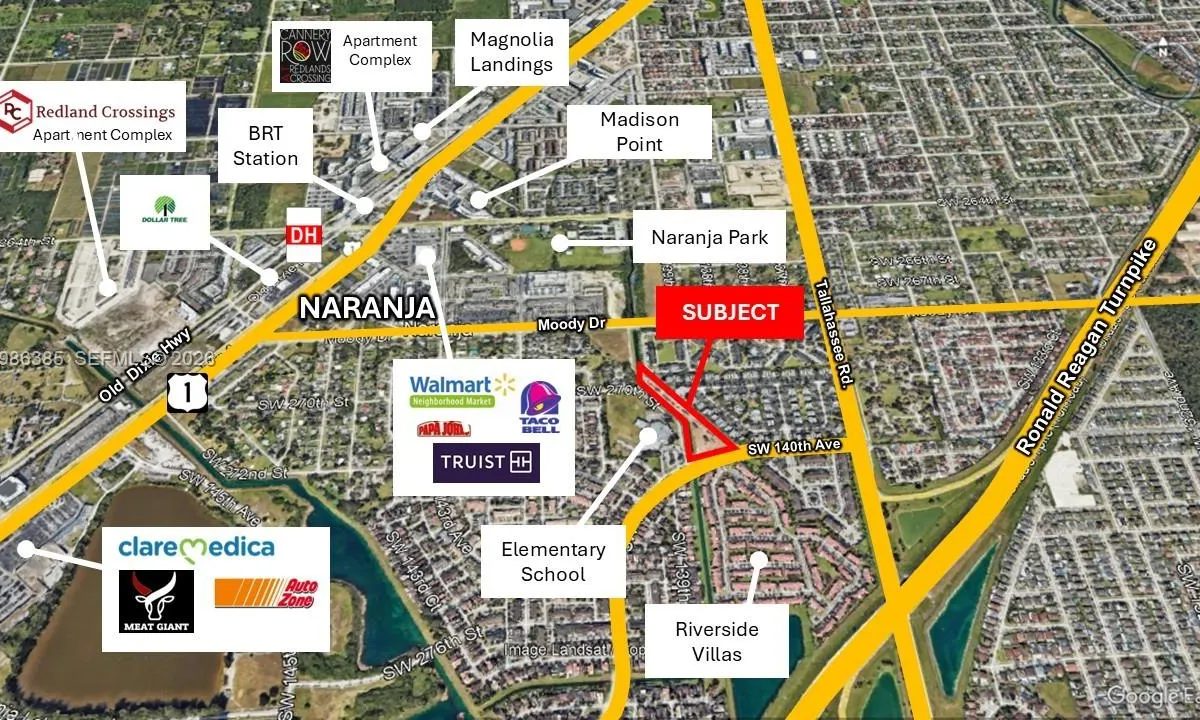 This development site represents one of the lowest price-per-acre opportunities in the Naranja/South Miami-Dade market, offered at $976,335 per acre-delivering exceptional value for investors and developers alike. The property is zone R-Edge within the Naranja Community Urban Center District, allowing multifamily developments. The site is comprised of 3 folios totaling 3.38 acres, with an allowable FAR of 3.7. The seller is currently in the process of obtaining ASPR approval for a 66-unit garden-style multifamily project. Additionally under the Live Local Act, the site may qualify for a density increase of up to 90 units, subject to verification of eligibility and compliance with program requirements. Located directly across from a school and with convenient access to US1, public transit, the Florida Turnpike and major commercial corridors. The site is also located next to a canal with adds a nice buffer and flexibility for site design.