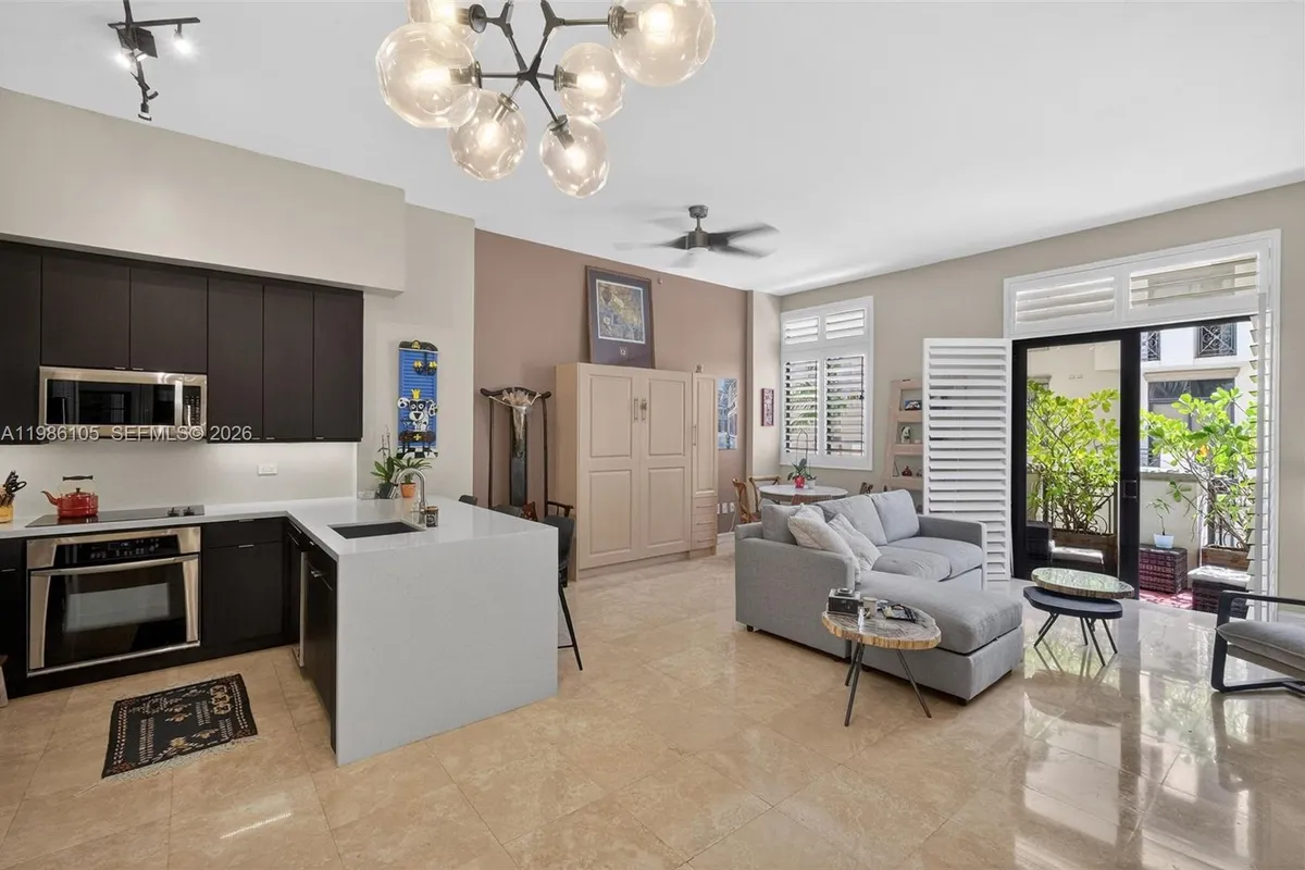Beautifully located in the heart of Coral Gables, largest 1-bedroom residence at Ponce Tower offers bright, open living with soaring 11 ft. ceilings, travertine marble floors, updated lighting, and real wood shutters throughout. The European-style kitchen features quartz countertops, premium appliances, and a spacious island with seating. The generous bedroom includes a walk-in closet, while a Murphy bed adds flexibility for guests. A Jack-and-Jill bathroom is ideal for hosting. Enjoy a private balcony overlooking the peaceful courtyard pool. Full-service building with 24-hour concierge, resort-style pool & spa, fitness center, and more—just minutes from Downtown, Brickell, and the beaches.