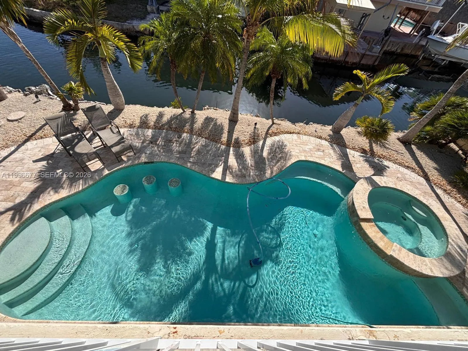Premium Waterfront Oceanside home in Key Largo, Florida on a point lot on a main canal featuring water frontage on two sides with 180-degree water views, deep-water docking with 80 feet of dock space, a 15,000 pound boat lift & a cut in slip for your boat just minutes from the open ocean with a beautiful underground pool and hot tub and tiki hut. This tropical paradise sits on the end of a private street on a cul-de-sac.