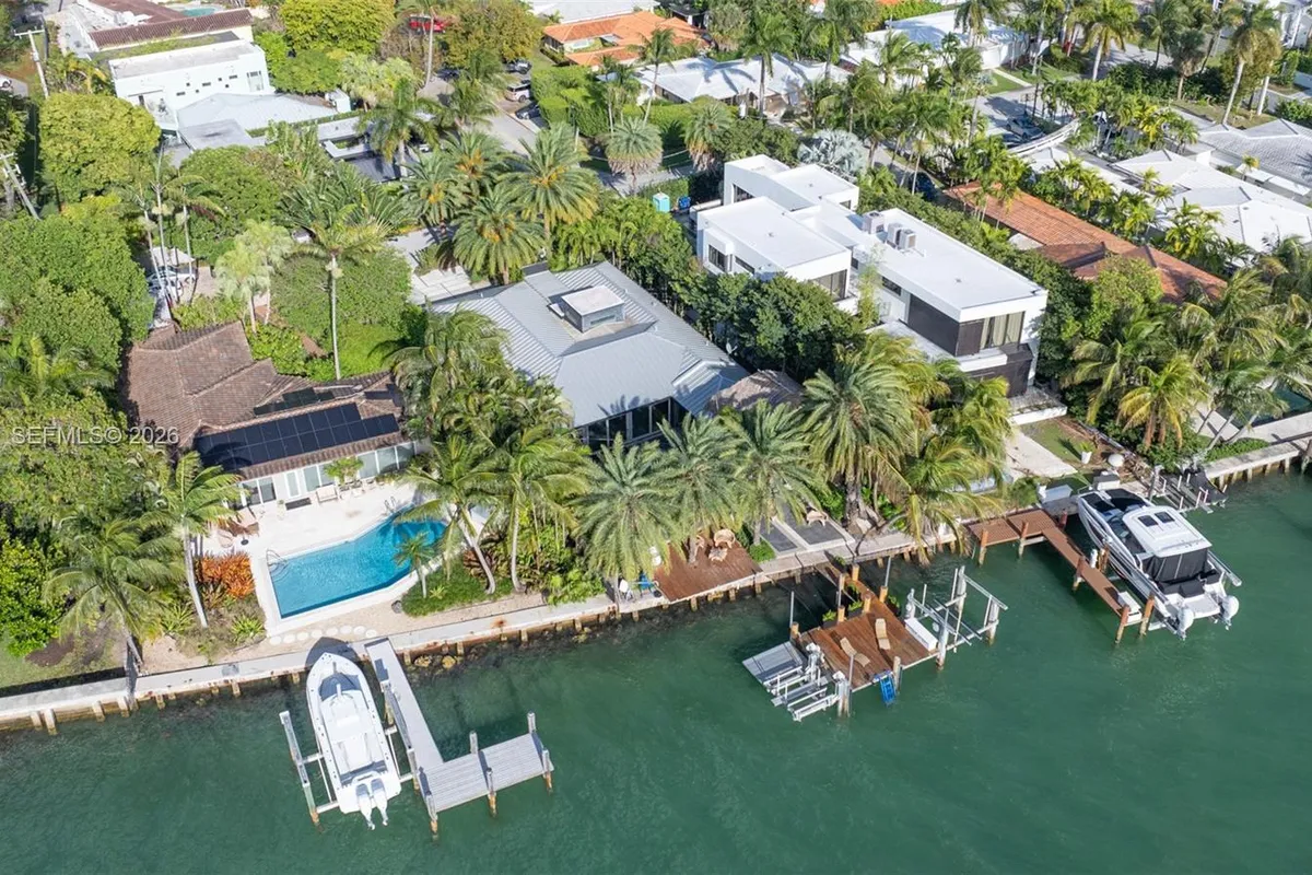 A rare waterfront home with a design you will not find again. Located on a quiet cul-de-sac inside the gated community of Normandy Shores, this property offers access to golf, tennis, basketball courts, and parks. Set on the island’s Terrace and shared with only a few homes, it captures wide open bay views and stunning sunsets. Built in 2015, the home offers approx. 3,442 SF with 4 bedrooms and 4 bathrooms. The layout flows through open living and dining areas into a modern kitchen designed for both function and entertaining. From the moment you arrive, the home creates a calm feel. A bamboo garden welcomes you, leading to a striking 30 ft interior waterfall that sets the tone throughout. The outdoor space is built to enjoy. Lush landscaping surrounds a pool, outdoor kitchen, and multiple terraces. Relax in the outdoor soaking tub, host gatherings under the two story tiki hut, or enjoy quiet evenings by the water. The private dock allows you to take in the bay at sunset. The property also includes boat and jet ski lifts, a davit, and plans for a future two car garage. A true opportunity for someone looking for a different kind of waterfront living experience.