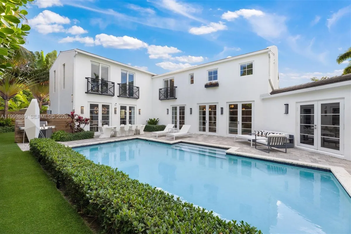 This luxurious Miami Beach estate presents a seamless blend of grandeur and chateau elegance. Privately set behind front hedging, the home welcomes you with a large driveway and an impressive sense of arrival. Offering exceptional privacy and space, the residence features 6 bedrooms and 6.5 bathrooms, each with its own ensuite. The open-plan kitchen is appointed with high-end finishes and top-of-the-line Wolf, Miele, and Sub-Zero appliances, flowing effortlessly into a spacious dining area and inviting family room. A formal living space, currently used as such, offers flexibility and could easily be transformed into a formal dining room. Just off the kitchen, a full laundry room and dedicated media room add convenience and functionality. The exquisite primary suite serves as a private retreat, complete with a sitting area overlooking the pool and patio. A chic office, which also functions as an ensuite bedroom, adds versatility and convenience. The first-floor guest suite impresses with its own kitchenette, living area, and direct access to the pool and patio, offering beautiful outdoor views. The backyard features an outdoor dining and seating area, and a side yard with room for a playground or garden. Ideally located near upscale dining and shopping, and just moments from the ocean, this residence embodies the ultimate Miami Beach lifestyle.