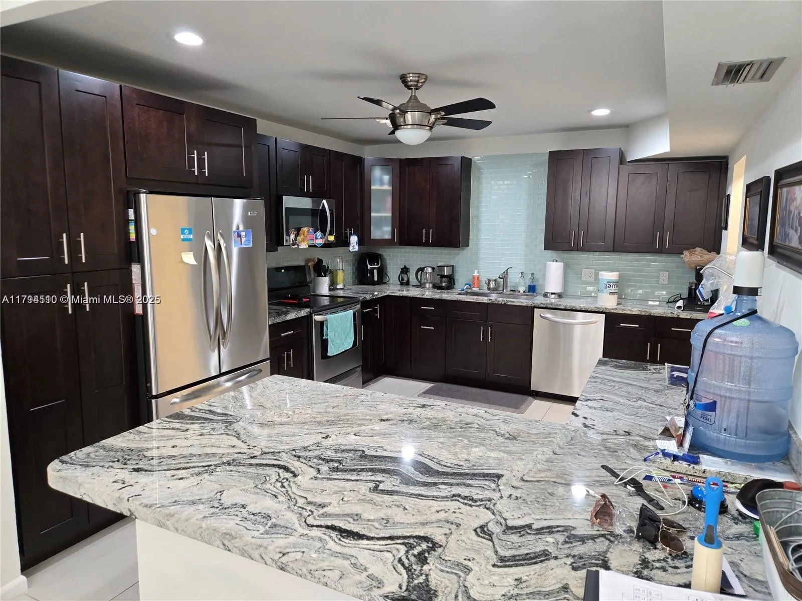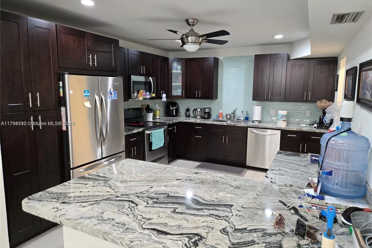 Foyer entry leads into a spectacular remodeled kitchen featuring beautiful cabinets, granite counters. Oversize stainless steel refrigerator, microwave. Coner island for your prep work. Lots of light and all open to the spacious family living area. Downstairs bedroom. Large tile throughout. Living area w/sunscreen window covers for energy efficiency. Screened patio . Upstairs are 2 bedrooms w/remodeled bathrooms. Washer/dryer. Two car parking space with guest parking close to the unit.