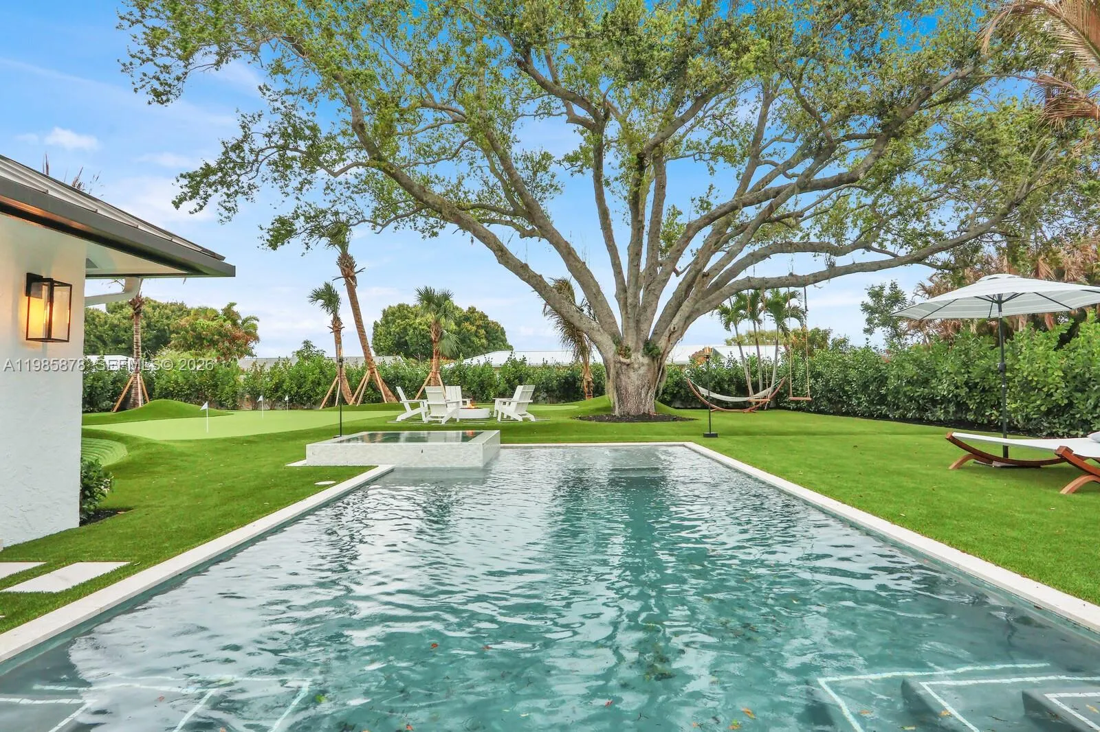 Interior designer completely rebuilt and re-imagined luxury modern coastal residence on a rare half acre lot beneath mature live oaks. Resort-style backyard is one of a kind, showcasing a century-old oak tree, a custom brand new heated pool/spa, summer kitchen with DSC grill, Zephyr hood, and lanai overlooking a professional grade putting/chipping green anchored by two Scottish-style revetted bunkers. Wonderful, thoughtfully designed open floor plan with high end finishes - Subzero/Wolf chef's kitchen, gorgeous wide plank white oak porcelain floors from Portugal, PGT impact windows/doors, and more. The primary suite offers a tranquil retreat with a spa-inspired bath and fully customized walk-in closets. Gated Turtle Creek golf community (membership optional). Unparalleled privacy in a golf setting. Minutes to Jupiter beaches, golf clubs, and waterfront dining. Enjoy peaceful evenings by the fire pit, relax in the hammock or unwind on the swings beneath the magnificent oak tree. This luxury home is all about peace, tranquility, privacy, and entertaining your friends. Move in ready (can be purchased turnkey furnished).